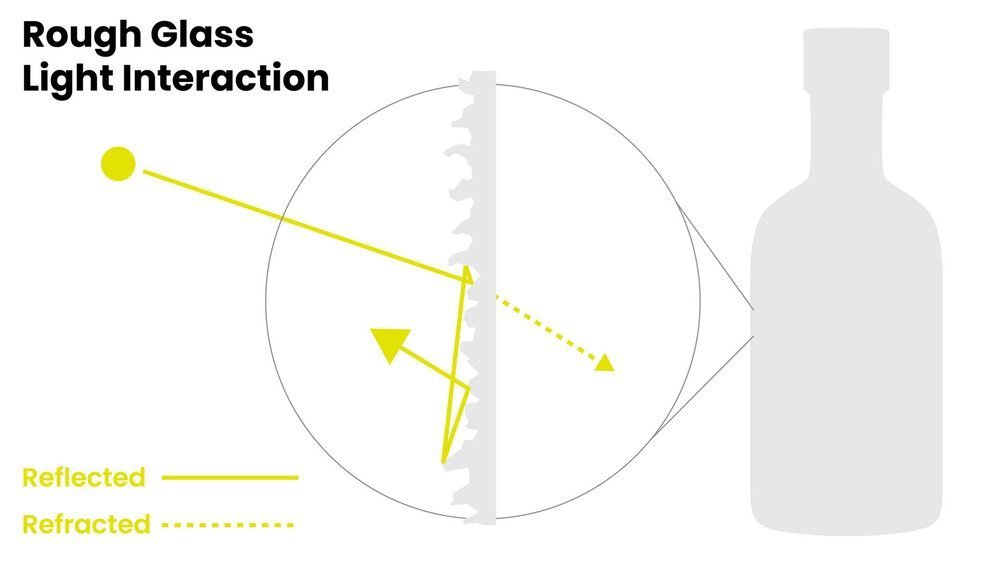 First off, let's explore why frosted glass looks the way it does. In real life, frosted glass is made by sand blasting or acid etching. This produces a pitted surface on the microscopic level. On smooth glass, some light is reflected off the surface while some transmits through the glass, making it look transparent.