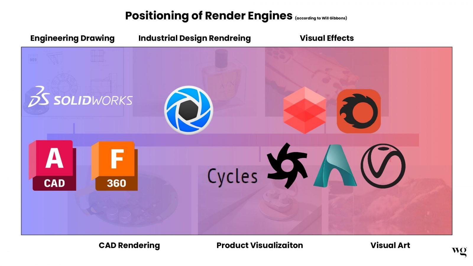 Here's my attempt to map some common rendering tools to each of these above categories. Take this with a grain of salt, as this is purely subjective.