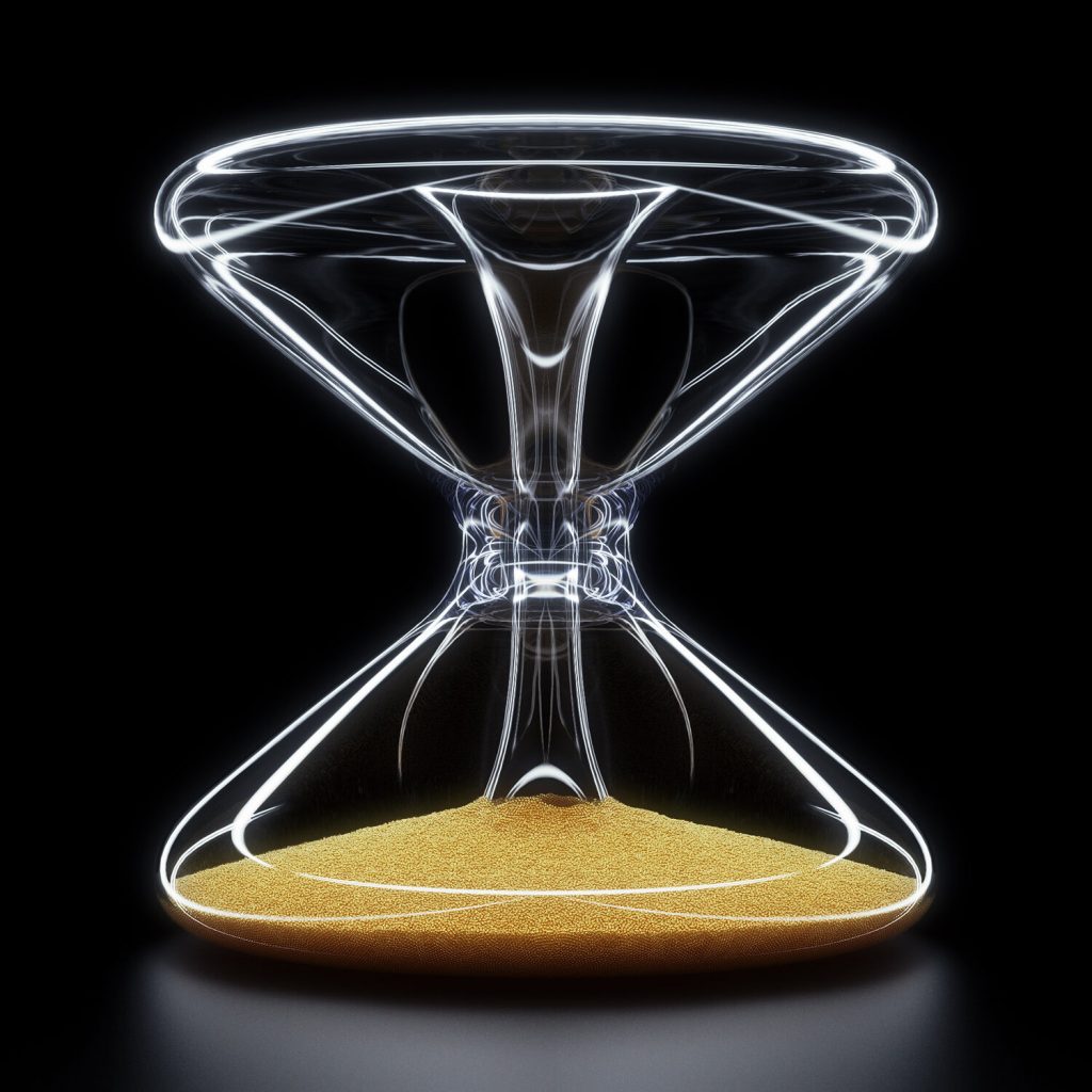 The grains flow around the center. Hence, the grains represent the passing of time. When you look down the center of the hourglass, you see there are no grains. This carries different meanings depending on the viewer. To me, it represents clarity. Therefore, the grains remind me that everything shall pass, good and bad. The center represents clarity, and a cosmic timescale. There were things before me and there will be things after me. It forces me to challenge my own beliefs and to find comfort in my mortality.