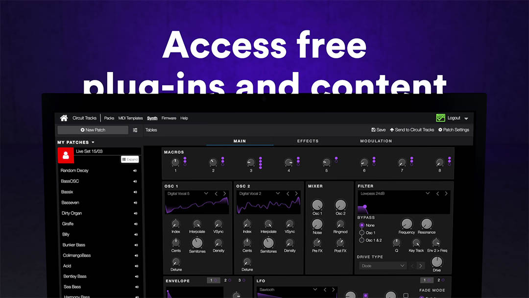 Circuit Tracks is a standalone groovebox for the modern producer. With two refined polyphonic digital synth tracks, four drum tracks, creative FX and on-the-go capabilities, it’s the perfect hands-on device for the agile music maker.