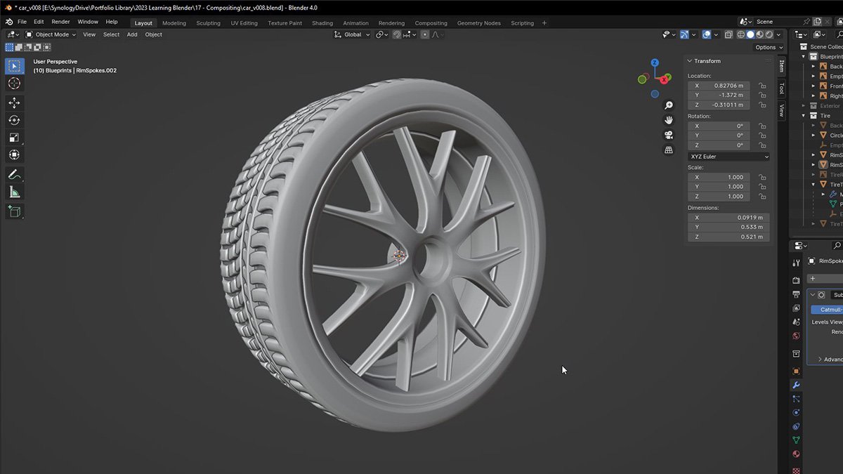 On days 31-39, I spent a total of 12 hours 54 minutes learning Blender. During this time I continued working on the car modeling exercise. That is such a large project that it’s taking me quite a while to finish. But I’m nearly finished with the wheels, which has been fun. Something about modeling a tire and rim is really satisfying.