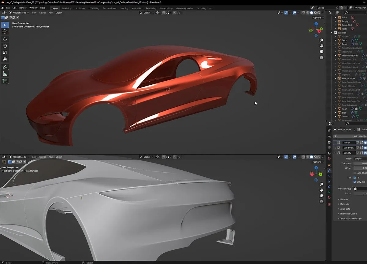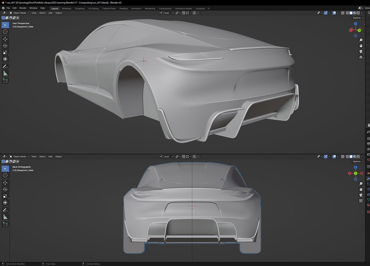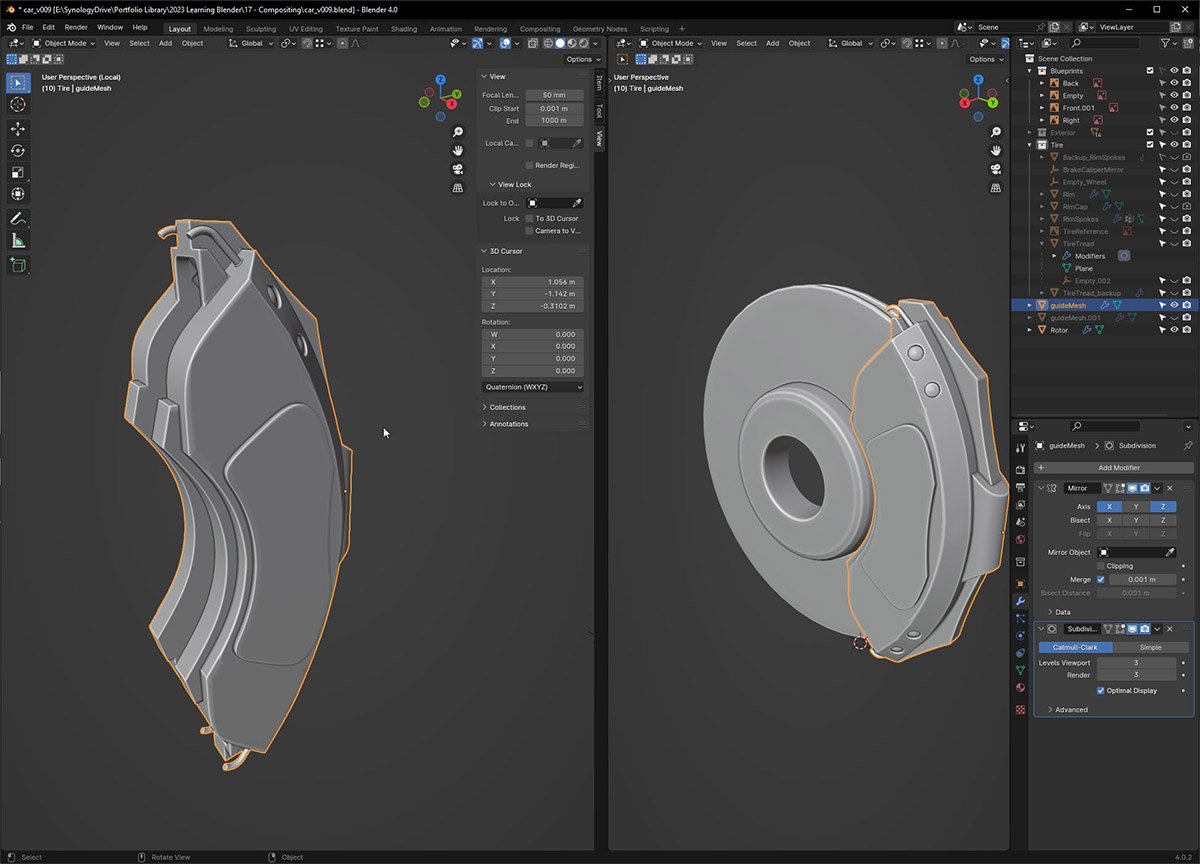 On days 41-49, I spent a total of 12 hours 37 minutes learning Blender. During this time, I continued working on the Tesla car model. I finished up the wheels which included brake calipers and rotors, then moved onto finishing up the body panels. This included applying some of the modifiers that were keeping the mesh shape and using actual bevels instead of edge creasing. I’m excited to be getting close to wrapping up this project!