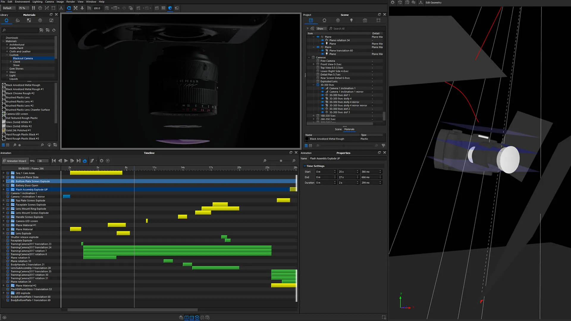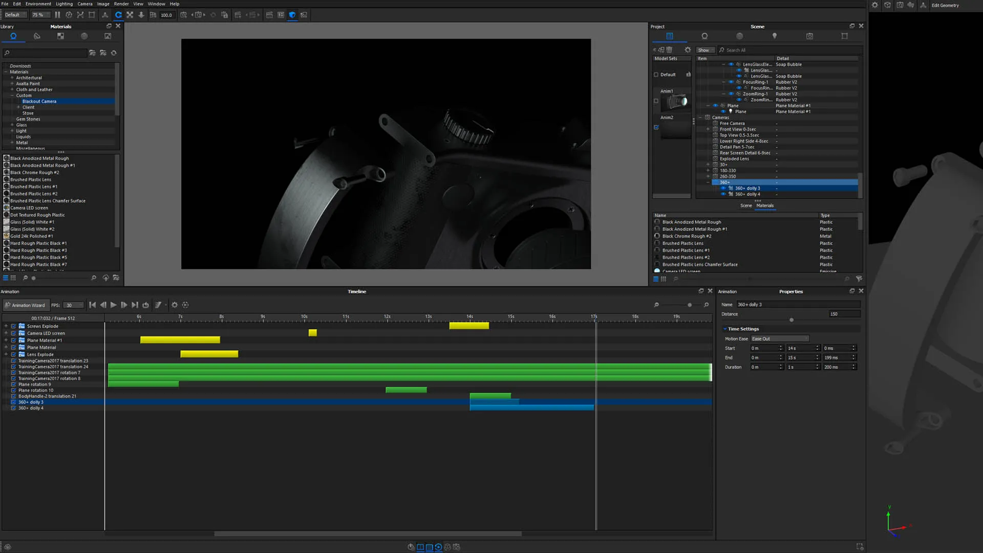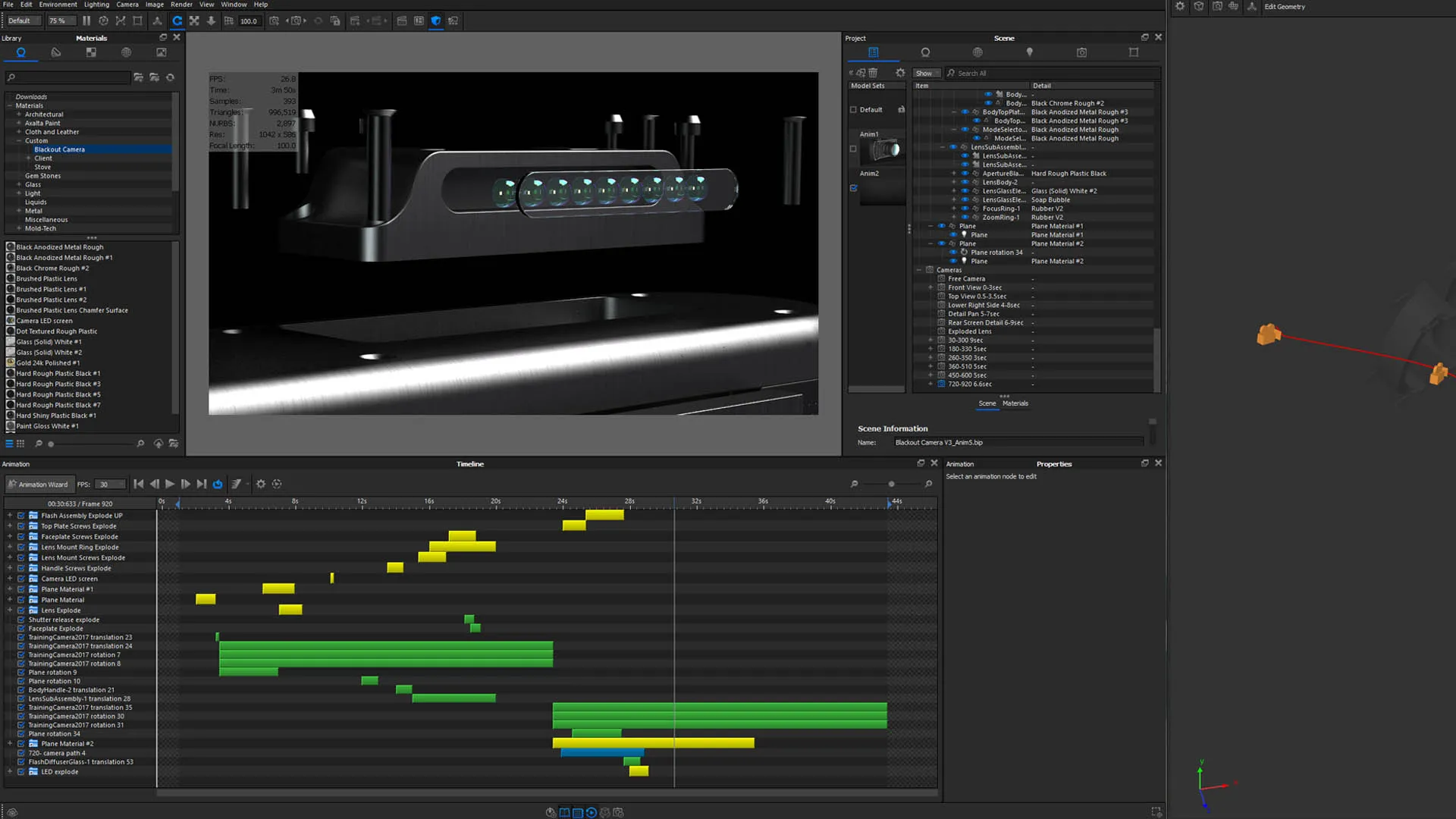 I animated the compact mirrorless camera in KeyShot using my typical approach. Being all about efficiency, I blocked in the major movements of the product. Then, I dialed in the timing of each movement. After I was happy with that, I worked in the little details that make the animation a bit more dynamic.