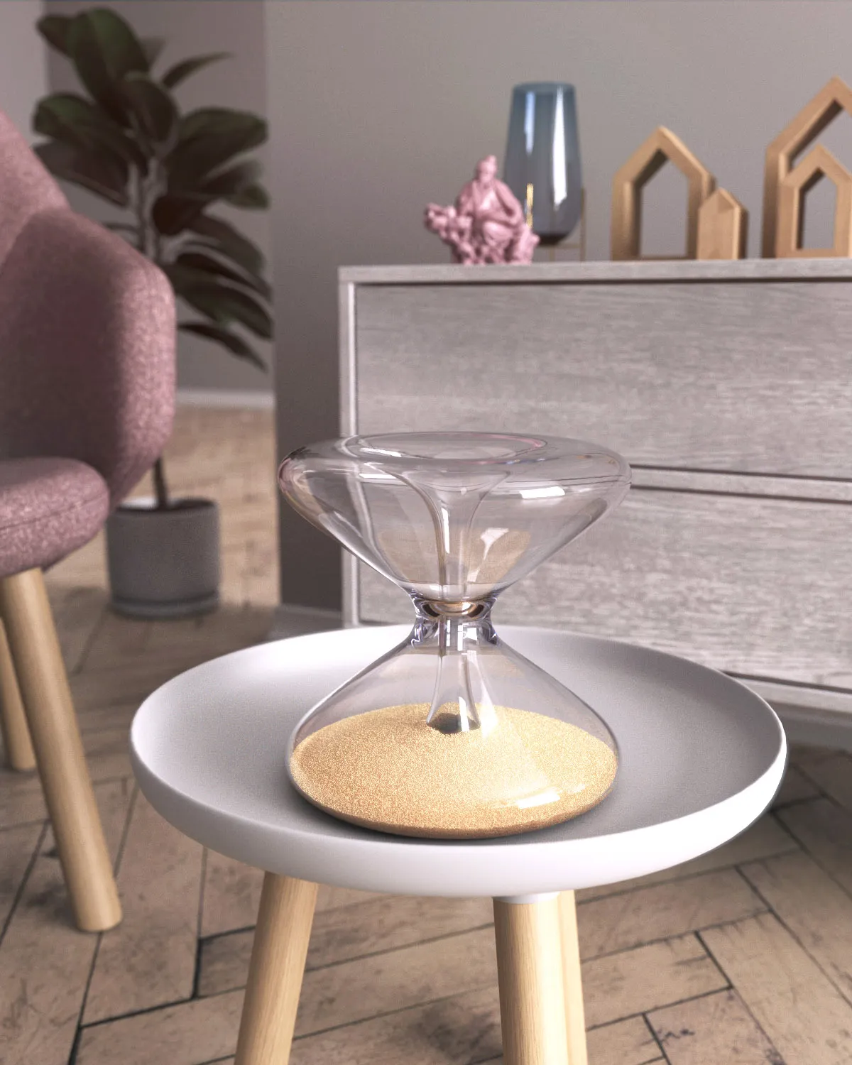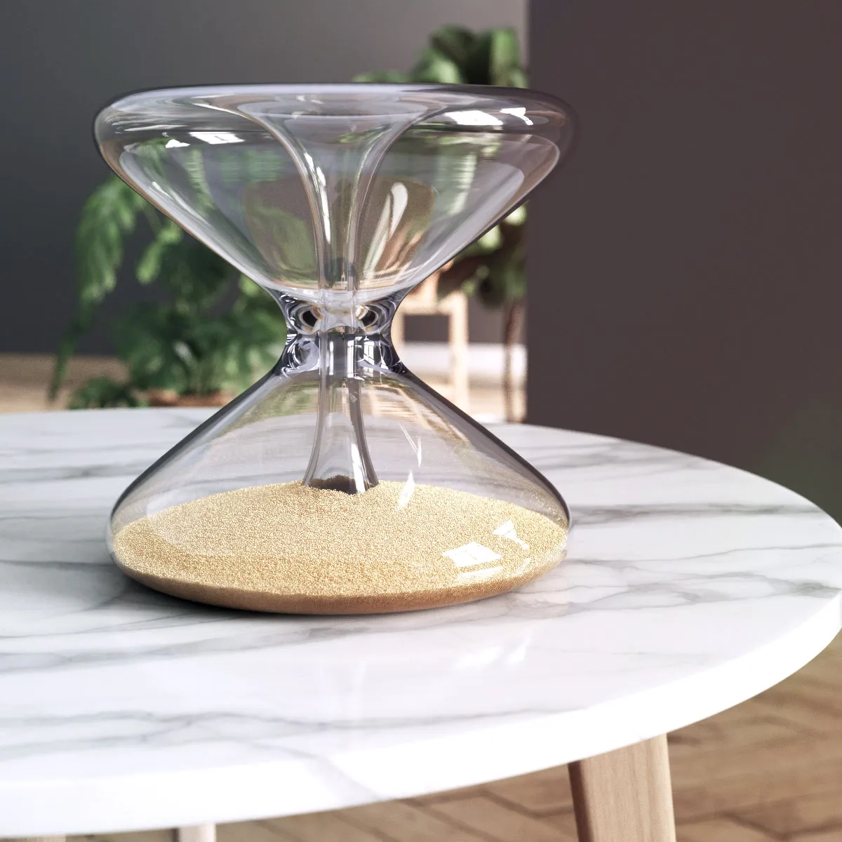I quickly modeled the glass in Fusion 360. I used Houdini to simulate the grains. This turned out to be a much bigger challenge than expected due to how many particles there were. Additionally, this was my first time using Houdini for a design. I converted the particles to geometry and export them in order to render them in KeyShot. This was an incredibly heavy process that required quite a bit of troubleshooting an patience.