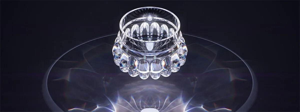 I created a dispersive glass material to apply to the 3D model. I then used a carefully placed light and lighting environment to illuminate the glass. Finally, I used a special material on the floor to capture the caustic patterns.