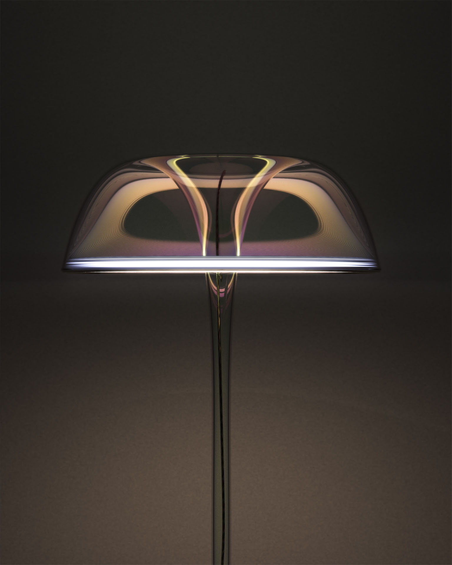 I reduced materials to colorless transparent plastic and light in an attempt to recreate gravitational lensing in a household side lamp. The Wormhole Lamp’s plastic represents the gravitational structure (a wormhole) and the LEDs represent the light emitted from stars in space. By coating the plastics with multiple layers of film at various index of refraction, I was able to achieve a multi-colored refractive response to the light transmitting through the plastic.