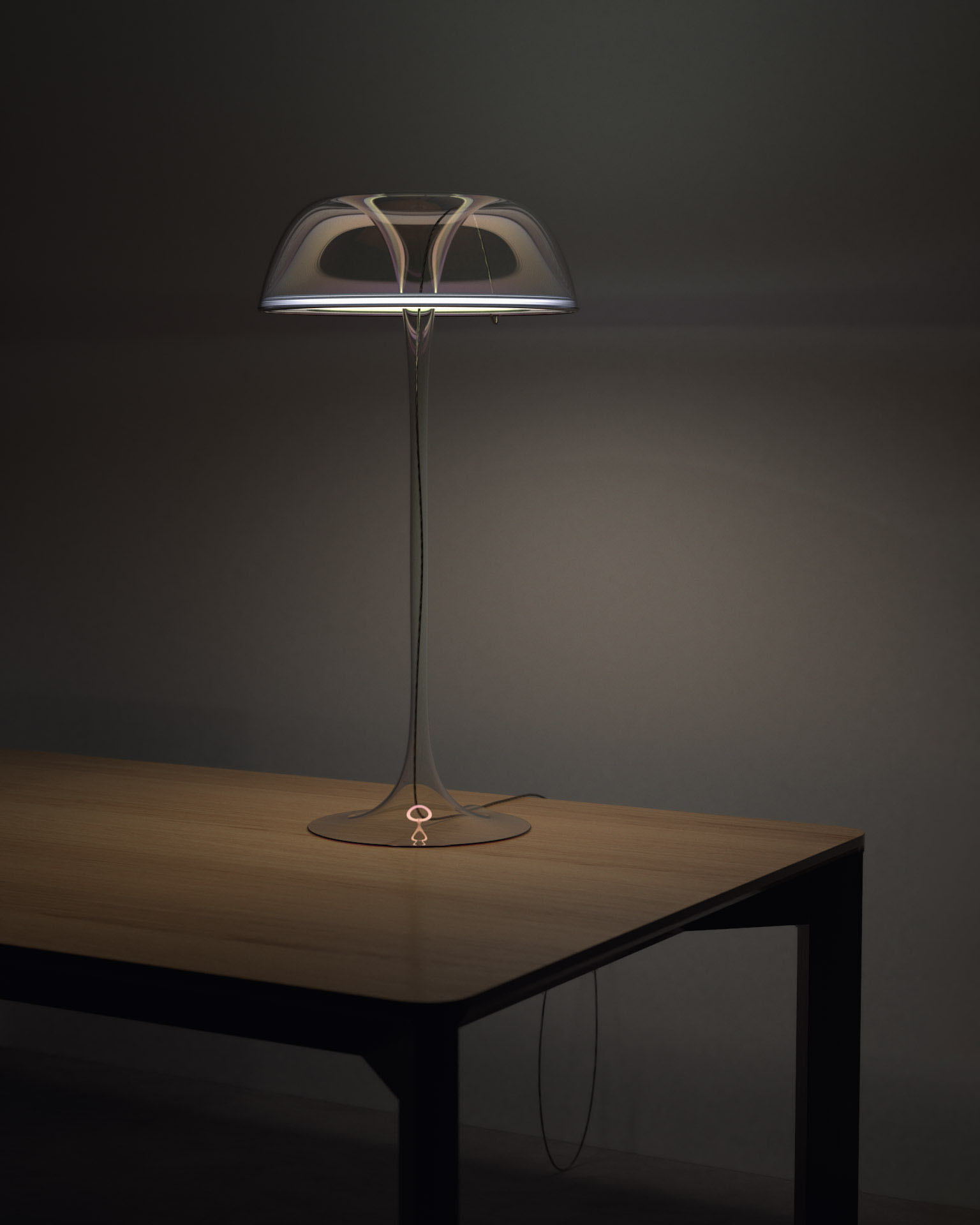 The Wormhole Lamp’s form originates in scientific illustrations of an Einstein-Rosen Bridge structure. Conventional space time is often represented by a plane and the quickest way to travel between points on this plane is to move in a straight line at the speed of light.